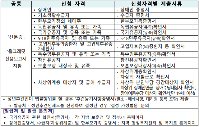 4) 차상위 장애인연금, 장애수당, 장애아동수당 대상자 확인서 → 위의 1) ~ 4)에 해당하며 확인서 또는 증명서를 발급받을 수 있는 분. 단, 장애아동수당 대상자의 경우 민법상 만 19세(2005.3.13.(포함) 이전 출생자) 이상인 자
